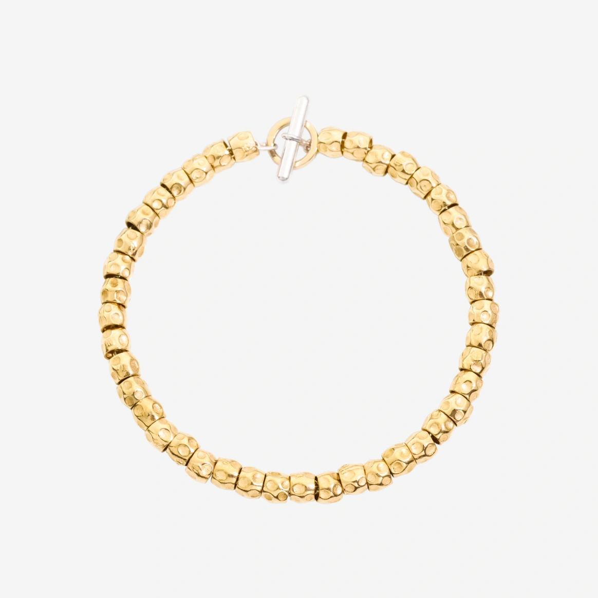 Bracciale granelli in oro giallo 18K, catena e t-bar in argento 925 e anello brisè in oro giallo 18K. Ago in argento 925 incluso.