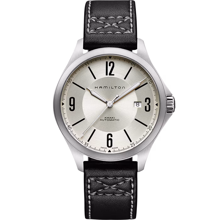 Powered by an automatic movement, the Khaki Aviation Auto is ready for adventure. The big numbers and indexes recall the pilot’s necessity to read watches with ease while in flight.