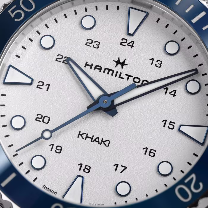 Esplora lo stile subacqueo con questo Khaki Navy Scuba Quartz. La sua incantevole lunetta blu, che brilla su un quadrante bianco e protegge l’orologio da elementi corrosivi come sabbia e sale, lo rende l’accessorio perfetto per l’estate.