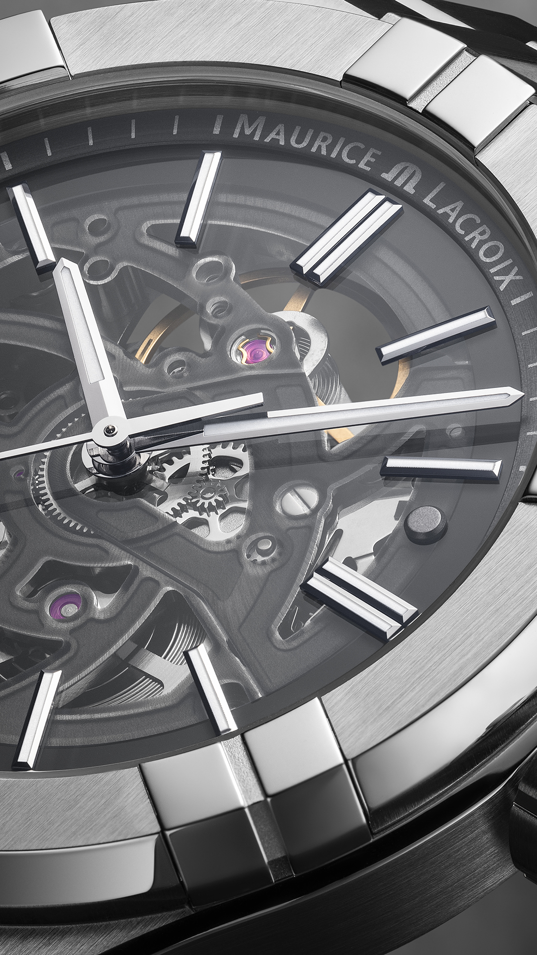 Il quadrante aperto, scuro e misterioso, rivela tutta la maestria del calibro automatico ML115, mentre il bracciale in acciaio integrato completa una silhouette moderna e tagliente, pensata per chi ama distinguersi con discrezione e carattere.
