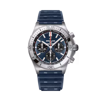 Available in a variety of materials from stainless steel to luxurious 18 k red gold, the Chronomat features a 42 mm case and the iconic bezel with the four rider tabs. Available in a range of colorful dials, the Chronomat is matched to the signature “Rouleaux” bracelet in metal or rubber and is powered by the in-house Breitling Manufacture Caliber 01, a COSC-certified chronometer.