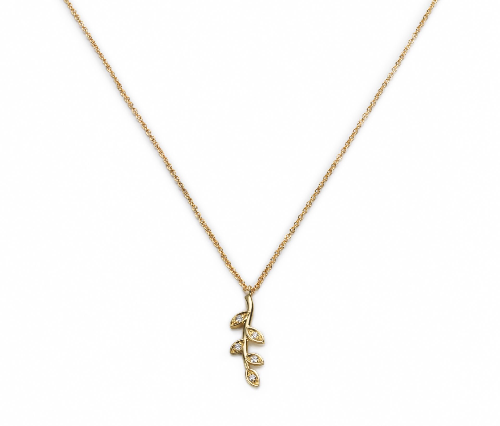 Raffinata e bucolica, la collezione Flora celebra la vitalità della natura interpretando in modo contemporaneo l’arte della gioielleria. La collana realizzata in catena d’oro giallo 18 kt presenta un rametto con foglie a lastra e diamanti bianchi che la rendono una creazione preziosa e versatile. Indossala da sola o abbinata ad altri gioielli della collezione Flora.