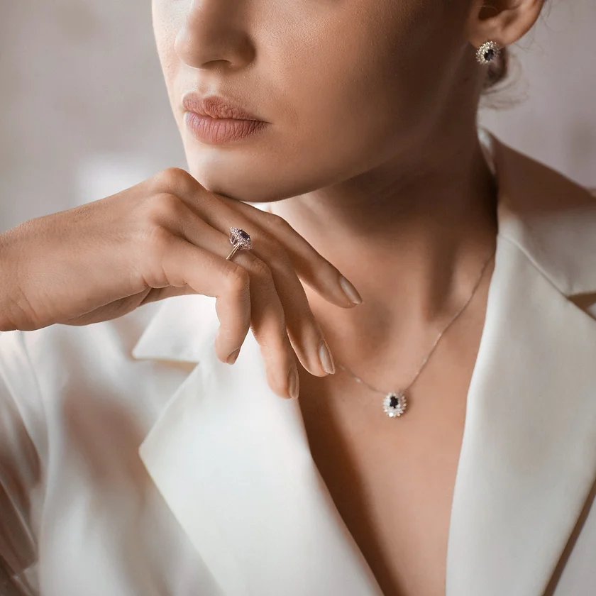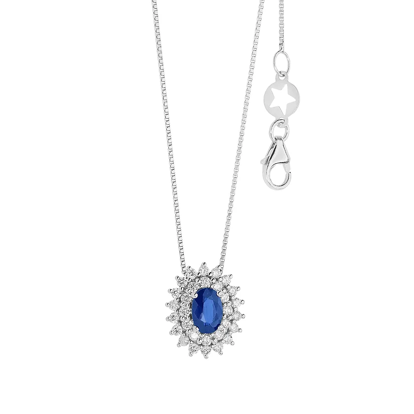 Girocollo in Oro bianco 750‰. Diamanti bianchi P.Ct. 39 Colore G Purezza SI. Zaffiro blu ovale 4×6 Ct. 0,65