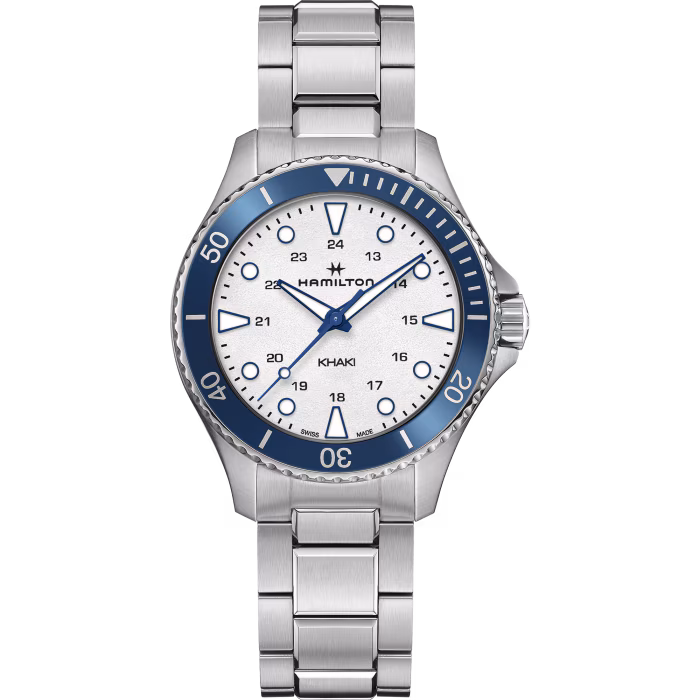 Esplora lo stile subacqueo con questo Khaki Navy Scuba Quartz. La sua incantevole lunetta blu, che brilla su un quadrante bianco e protegge l’orologio da elementi corrosivi come sabbia e sale, lo rende l’accessorio perfetto per l’estate.